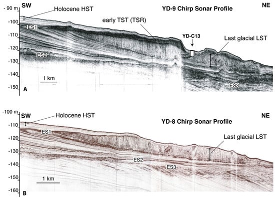 Seismic profiles YD-9 (A) and YD-8 (B) show the last glacial LST on the South Adriatic outer shelf (modified from [56]; location in Figure 1 and Figure 5). This corresponds to the most distal progradational unit within sequence 1 (encompassed by ES1 and ES2), formed at the end of the last glacial sea level fall. This shelf edge LST consists of a lenticular wedge with a patchy distribution (Figure 5), rapidly passing to a thin draping veneer at depths greater than 130–140 m. Note the opaque seismic facies, sharp basal contact and erosional top surface (with channel incision in YD-9), indicating marine erosion and reworking. An early TST unit is present only in YD-9 seismic profile (A), which correlates with deposits to the south interpreted as transgressive sand ridges (TSR). The absence of this unit in YD-8 seismic profile (B) marks the northern limit of the TSR distribution area. The target of core YD-C13 is also reported (compare with Figure 5, Figure 6 and Figure 7).