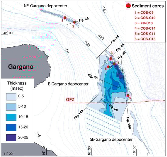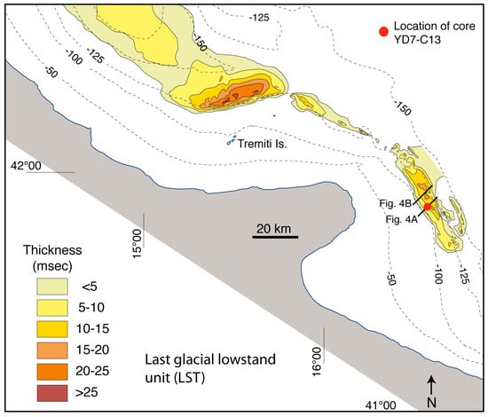 Isochronopachs (1 msec ≅ 0.75 m in the investigated interval) of the last glacial LST shown in Figure 4 (modified from [56]). This unit is a progradational wedge on the outer shelf and thins into a distal drape (less than 10 msec) on the upper slope north of Tremiti Islands. Further north of the mapped area, it correlates with the paleo-Po prodelta lowstand wedge, forming a progradational unit with a thickness >200 m together with the lower TST unit (Figure 3C).
