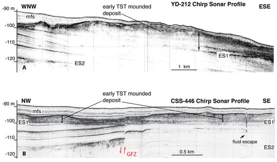 Seismic profiles (location in Figure 1 and Figure 6) showing the opaque seismic units with mounded morphology that represent early TST deposits landward of the E-Gargano shelf edge TSR. From NE (A) to SW ((B) modified from [51]), the mounded morphology and relief attenuate below a progressively thicker cover of late TST and HST deposits. Further landward, the early TST deposits pass laterally and vertically to the middle TST (area not mapped in Figure 6). Profile CSS-446 (A) shows displacement along the GFZ, also responsible for differential uplift/lowering of shelf sectors.