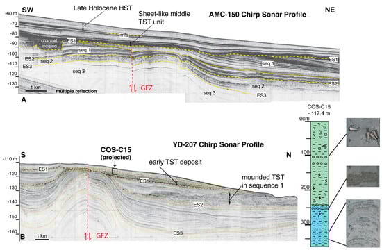 Seismic profiles (location in Figure 1 and Figure 6) evidencing the absence of mounded TST deposits in shelf sectors shallower than −90 m ((A) modified from [51]), and the southward thinning/flattening of TSR deposits along the shelf edge ((B) modified from [44]). AMC-150 seismic profile (A) shows an opaque TST unit that correlates landward with middle TST deposits, although directly overlaying ES1 unconformity (affected by channel incision along the south-eastern flank of the anticline). In YD-207 seismic profile (B), early TST deposits that correlate with TSR at north form a flat-tabular unit terminating against the flank of the anticline, by this marking their southward limit. A detail of the core that reached these deposits is shown (see Figure 6 and Figure 7). Note the mounded-irregular TST unit at the base of sequence 1 (on top of ES2), interpreted as older equivalent of TSR mounded deposits.
