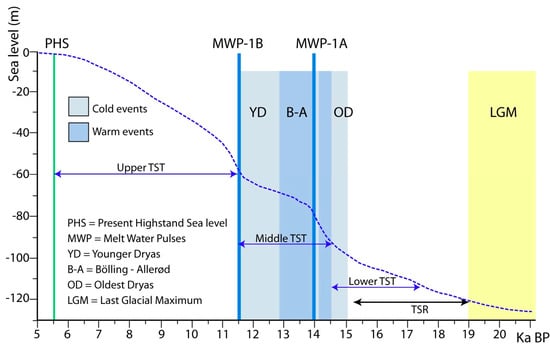 By comparing the distribution of the TSR depocenters (Figure 6) with that of the last glacial LST deposits (Figure 1 and Figure 5), it is evident that the TSR develop on top and slightly landward of the LST (where this unit is preserved), actually marking the turn-around point from lowstand to rising sea level (at the closing of the LGM, between 26 and 19 ka BP according to [60]).