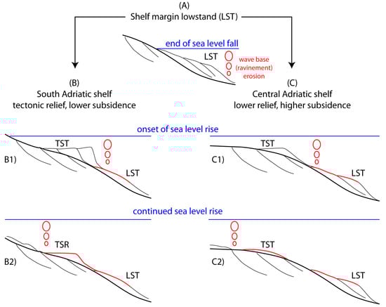 At the onset of the post-glacial sea level rise, morpho-tectonic relief and higher gradients on the South Adriatic shelf margin enhanced transgressive (ravinement) erosion of older (lowstand) shoreline deposits, in contrast with their flooding being favored in the subsiding Central Adriatic shelf (Figure 12). Reworking of pre-existing near-shore lowstand deposits provided the local source of coarse sediment, independent of fluvial input (essentially confined to the northern area of the basin). This local reworking-supply mechanism can be envisaged as analogous, although reversed, to the “cannibalization” of pre-existing shoreline deposits during sea level fall and “forced-regression” [82].