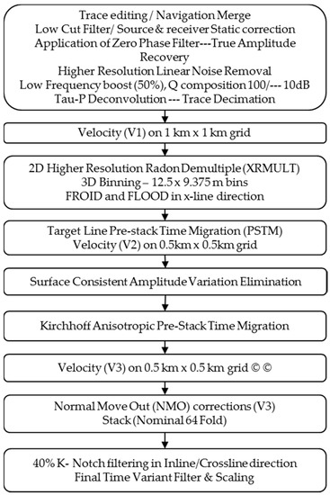 Figure 4 shows the use of a processing workflow to image the data. Initially, raw data is provided to the processor, in which there is trace editing with the navigation position; later on, these were merged together accordingly. In order to enhance the signal and reduce noise, filtering and gain were applied to the raw data to increase the quality of the data. Q compensation is a data processing technology used for enhancing the resolution of the seismic data; Q is the seismic inelastic attenuation factor or seismic quality factor which measures energy loss as the seismic wave moves. Tau-p is described in terms of slope dt/dx = p and intercept time, and the arrival time is obtained by projecting the slope back to x = 0 where x is the source-receiver distance. Normal moveout (NMO) corrections are applied to the data due to the effect of the distance between the seismic source and the receiver on the arrival time of a reflection in the form of a time increase with offset. Velocity data obtained during NMO correction are used for stacking the data. This stack data were fed into the diffraction separation algorithm using the method below.