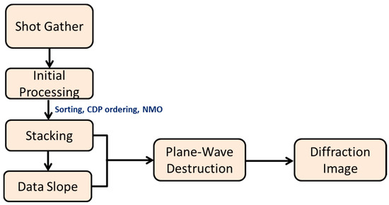 14]. A workflow which uses the plane wave destruction for diffraction imaging is shown below. Plane-wave destruction of common-offset data may face difficulties extracting diffractions in regions which have a complex geology and velocity variation [