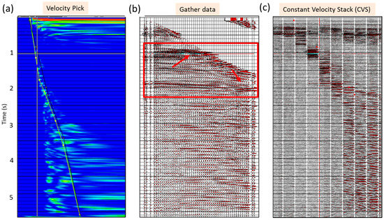 Figure 6b shows the gather flattening. After the correct velocity picking, the flattening of the reflector is checked as shown inside red area with red arrows, and this successful picking velocity also helps to improve the velocity model for the stacking of the gather data into the angle and further to full stack data.