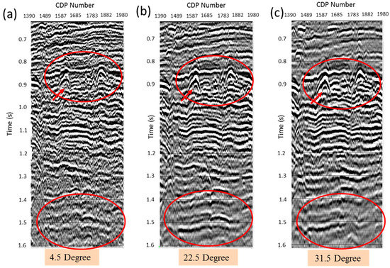 Angle stack seismic data at three different angles (a) Range limited stack data with 4.5 degrees, (b) 22.5 degrees, and (c) 31.5 degrees.