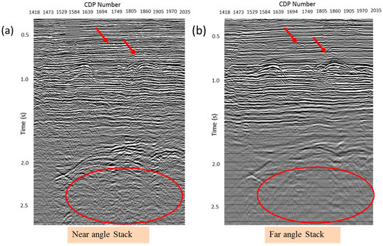 Partial stack seismic with: (a) a near angle stack of 4.5 degree which is almost equal to a zero-offset section, and (b) a far angle stack of 31.5 degrees.