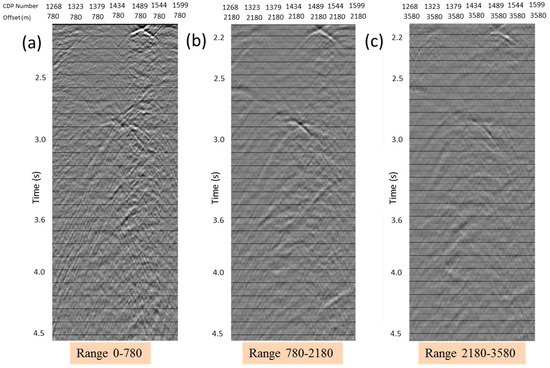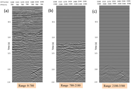 Multiple offsets gather data shows that shallow data is not recorded in the far offset. (a) range limited stack of 0–780 m, (b) 780–2180 m, and (c) 2180–3580 m.