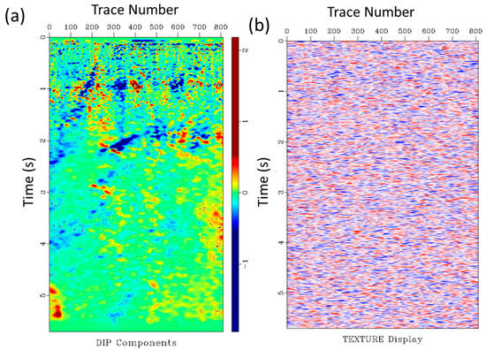 (a) Estimated dip field of data, and (b) texture computed by convolving field numbers with the inverse of the plane-wave destruction filters.