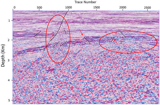 Figure 15. The final migration result includes both diffraction and reflection data, enhancing the resolution of the data. Inside the red circle on the left side, a major fault is imaged and can be interpreted, while in the red circle further on the right side small-scale faults are illuminated after imaging.