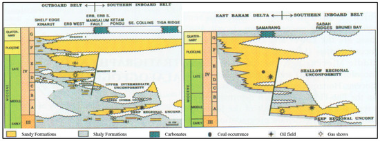 The X Field, which lies to northwest of the Southern Inboard Deformation Belt, is located in the outer shelf of the West Sabah Basin. Figure 1 shows the simplified geological map of Sabah outlining the Neogene Basins and their sub-basins. The Sabah Basin is a structurally complex basin with 12 km thick Neogene sediments deposited within the deep marine and progradational shelf-slope environment [1]. Figure 2 schematically shows the stratigraphy of several east–west tracts of the Sabah Basin. The sedimentary sequences of Sabah Basin are informally called “Stages”. The recognition of major unconformity-bounded sedimentary packages of Stages IVA (sedimentary sequence Stage IVA) to IVF (sedimentary sequence Stage IVF) resulted from its complex syn-tectonic sedimentary history [2,3]. Oil and gas exploration activities have been sparse in the Northeast Sabah Basin (Figure 1), where minor discoveries were found in deltaic sandstones. Other targets within the basin include deep water fans and carbonate build-ups. Adequate knowledge on facies distribution and depositional environment is essential to delineate hydrocarbon potential. Facies analysis is able to provide some predictability to the facies distribution of the area of interest or between the data points (wells). A facies model is ideal for summarizing the sequence of facies within a specific depositional environment [4]. Genetic description is advantageous, as it potentially adds some predictability to the analysis from the determination of the sedimentological controls over the geometry of facies and genetic associations with other facies. The interpretative description of facies may reflect a particular depositional process or depositional environment of a certain unit of strata.