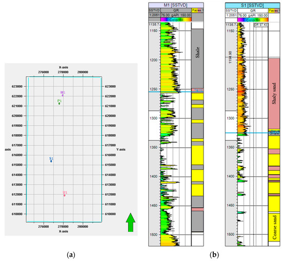 (a) Base map of the study area showing the well locations. (b) Identification of lithofacies from Well M1 and Well S1. The gamma ray response distinguishes the low gamma ray value of sand from the higher value of shale.