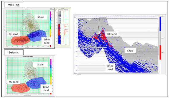 AI-Vp/Vs cross-plot (left) and 3D seismic section (right) showing the separation of shale, HC (hydrocarbon) sand, and brine sand zones.
