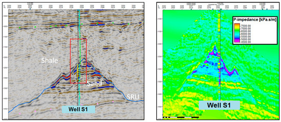 According to the interpreted seismic section and geological setting of the area, two prominent facies are identified, namely sandstone and shale due to their distinct lithological variations. Figure 6 shows the seismic section through Well S1 and the reservoir interval. Above the Shallow Regional Unconformity (SRU) are shale beds acting as reservoir seal. Shale is consistently found in all of the wells in X Field. Below the shale, high-amplitude reflections at the sandstone layer show the interface response of the hydrocarbon accumulations. The reflection within this interval has good continuity and high to moderate amplitude variation. The logs (gamma ray and porosity) show that at Well S1, the dominant lithofacies in the reservoir interval is sandstone. Referring to the stratigraphic scheme of Sabah Basin, the sequence above SRU is identified as Upper Miocene in age and categorized into Stage IVC.