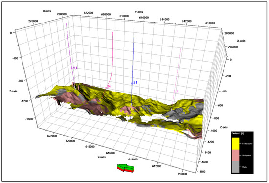 Using Sequential Indicator Simulation (SIS), a facies model is produced by the mean of distributing discrete facies throughout the model grid. In this study, two fundamental facies types were determined in the X Field reservoir based on the well data input and the spatial distribution induced by trend models. Figure 7 shows the facies model indicating the sand and shale distribution in the study area. Previous studies indicated that the area of interest is characterized by the East Baram Delta depositional environment (which includes deltaic, shelf, and slope sediments deposited in an overall progradational system from Middle Miocene to younger stages of Stage IVC (sedimentary sequence stage IVC) [18].