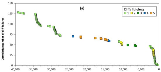 The space distribution of cliff failures is quite irregular along the studied coast, with the cumulative plot of horizontal area lost at the cliff top against cliffs length (Figure 2) enabling the computing of a global cliff retreat rate of 2.3 × 10−3 m/year, which corresponds to the slope of the linear regression of the cumulative plot divided by the number of years of monitoring (63 years). This value should be faced as a lower bound estimate due to the impossibility of detection of the smaller failures. The Figure 2 plot also enables the objective separation of sub sections with homogeneous retreat behavior, for which were computed mean retreat rates varying within two orders of magnitude from 2.7 × 10−2 m/year in sandstones with interbedded marls, to 7.8 × 10−4 m/year in lower Cretaceous dolomitic limestones, and 1.7 × 10−4 m/year in strong limestones included in the Albian-Cenomanian unit (Table 1).