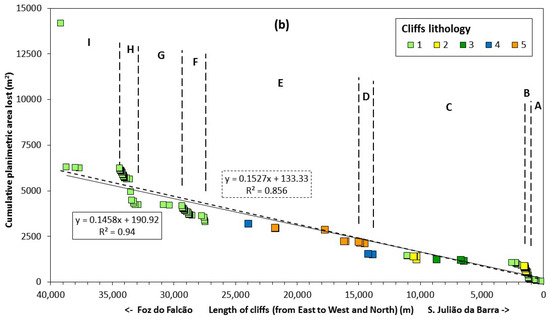 (a) Space distribution of number of cliff failures along cliff length, from the SE end of the study area (left) to the northern end (right) with colors indicating cliff failures lithology. (b) Space distribution of cumulative planimetric area lost at the cliff top caused by failures, along cliff length, with the limits of cliff sectors considered for cliff retreat computing (A to I, see text and Table 1). Regression lines and the equations slopes are measures of global cliff retreat rate, considering all failures (doted lines) and not considering the large translational failure at the northern end of the study area (plain lines). Main lithology of cliff failures: 1—Marls and limestones; 2—Sandstones and marls; 3—Limestones; 4—Limestones and marls; 5—Plutonic rocks (Sintra massif).