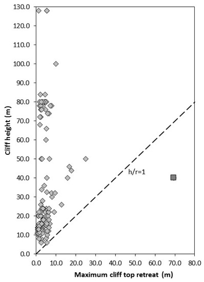 Maximum cliff top retreat caused by failures against cliff height. Square indicates the large translational slide occurred in the northern end of the study area.