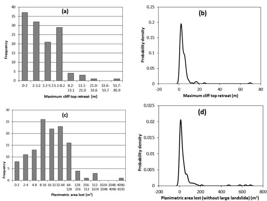 Maximum cliff top retreat (a) and kernel density estimation (KDE) (b). Planimetric area lost at the cliff top (c) and KDE without the large translational slide occurred in the northern end of the study area (d). Length of cliff affected (e) and KDE (f). Histograms with log based bins.