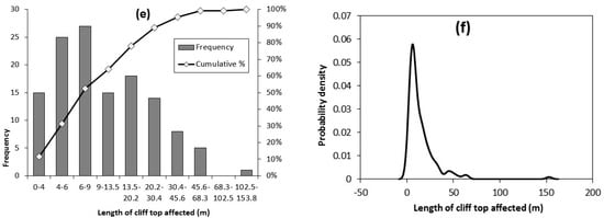 The maximum recorded local retreat of the cliff top was 70 m, caused by the exceptional translational slide occurred in the northern end of the study area, with the more frequent values in the range of 1 m to 8 m (Figure 3 and Figure 4). It was not found any significant relation between cliff height and maximum cliff top retreat (Figure 3), with all cliff failures except the large translational landslide causing retreat lower than the cliff height. The length of cliff top affected by the failures varied within a large range (Figure 4), from less than 4 m to approximately 150 m, with the values lower than 30 m corresponding to circa 89% of the inventoried cases. The total amount of cliff top affected by failures was 1931 m, which corresponds to circa 4.7% of the total length of cliffs in the study area.