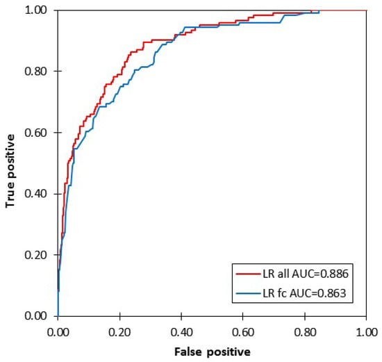 ROC curves of the models produced with the corresponding areas under the curves (AUC). Legend: LR all—Logistic regression with all factors; LR fc—Logistic regression forward conditional.