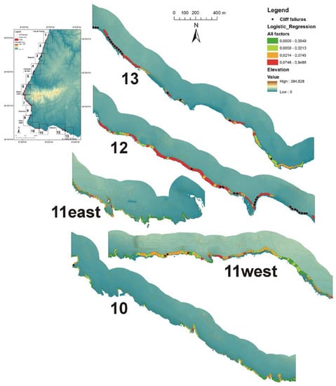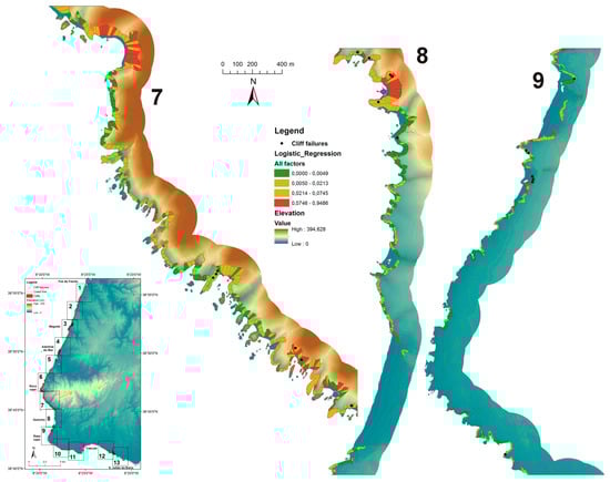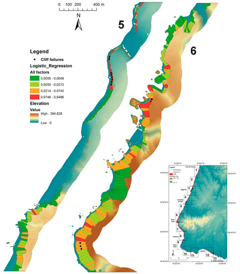 In Figure 6, Figure 7, Figure 8 and Figure 9 there are the maps which express the adequacy of the all factors model results to adjust to the cliff failures inventory, with the model probabilities classified in four classes with quantile defined limits, which enable a visual confirmation of the numerical results obtained. Due to space constrains, in the supplementary file there are more detailed maps which contain, for all the studied cliff sections, the predisposing factors lithology, toe protection and mean annual wave power together with the logistic regression model considering the contribution of all the predisposing factors used in this study.
