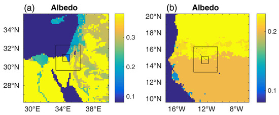. This is a wide range of albedo and is used to study the effect of albedo difference under extreme albedo conditions. For the Israel-Egypt example, the country border line was chosen to be the albedo border line, and the albedo was changed only in the innermost grid (