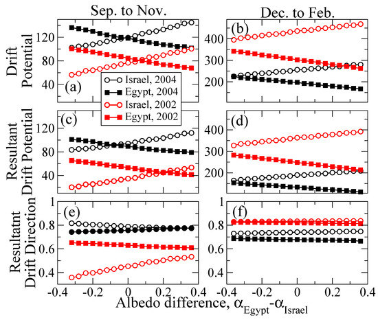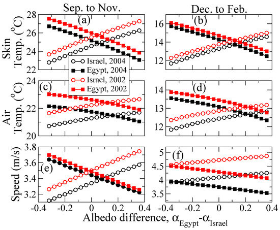 Figure 3a,b depicts the surface (skin) temperature on the Israeli and Egyptian sides, from September to November and December to February in the years 2002–2003 and 2004–2005, as a function of the albedo difference between the Egyptian and Israeli sides; a specific example of this temperature is depicted in