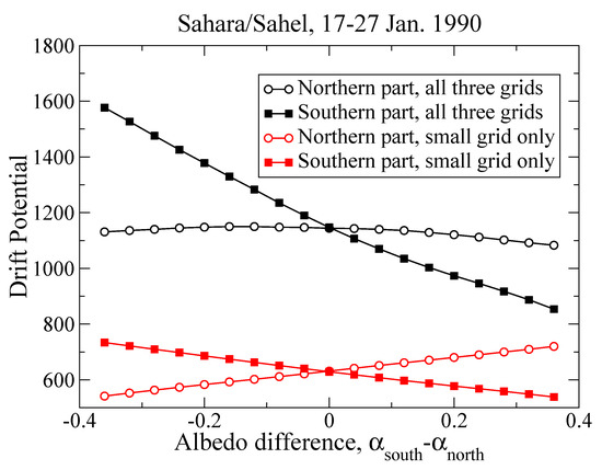 Figure 5, we show the DP as a function of the difference in albedo between the southern and the northern parts. When the albedo was changed only in the inner grid, the DP depended linearly on the albedo difference and increased (decreased) in the lower (higher) albedo region. When the albedo was changed in all three grids, the DP was up to twice as large as the results obtained when the albedo was prescribed only in the inner grid. Here, DP varied linearly in the southern part but, surprisingly, remained roughly constant in the northern region. It is possible that a simulation over the entire season may yield different, more linear relations.