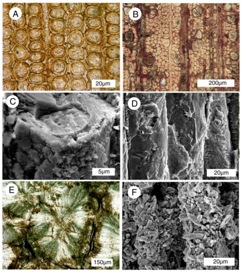 Phosphatized wood. (A,B) carbonate-fluorapatite, Virgin Valley, Nevada, USA, Miocene, radial view; (C,D) fluorapatite, Santa Fe River, Florida, USA, Neogene, radial view; (E,F) small euhedral apatite crystals on cell walls in carbonized wood, Yuba River, Nevada County, California, USA, Eocene, (E) oblique transverse view, (F) radial view.