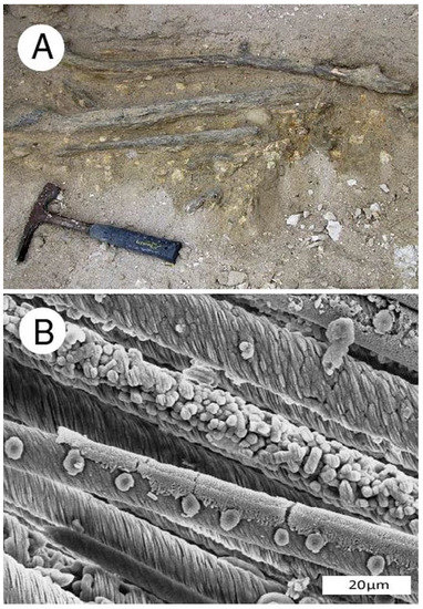 Phosphatized Miocene wood from Bruneau, Idaho, USA. (A) Driftwood limbs in lacustrine sediment; (B) SEM image showing tracheids mineralized with carbonate fluorapatite. Radial view. Spiral texture characterizes reaction wood, where asymmetric growth occurs in trees growing non-vertically. One tracheid shows circular casts of intertracheid pits, an adjacent tracheid is filled with blocky apatite crystals.