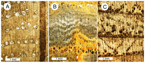 Thin sections of phosphatized angiosperm wood from Bruneau, Idaho USA, transverse orientation. (A) Carya sp.; (B) Ulmus sp.; (C) unidentified hardwood. Photos courtesy of T.A. Dillhoff, used with permission.
