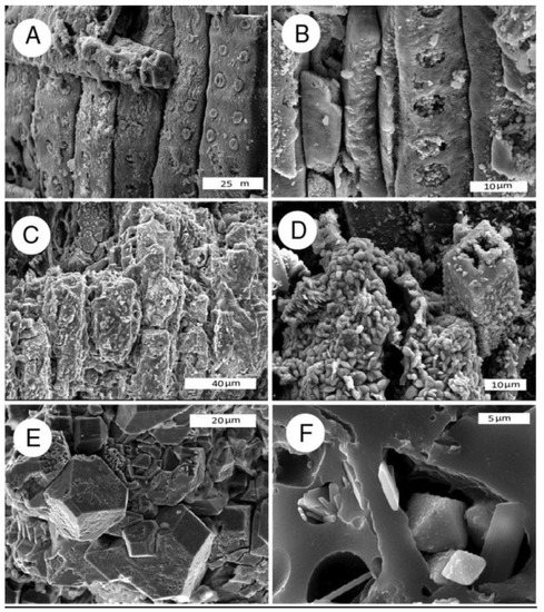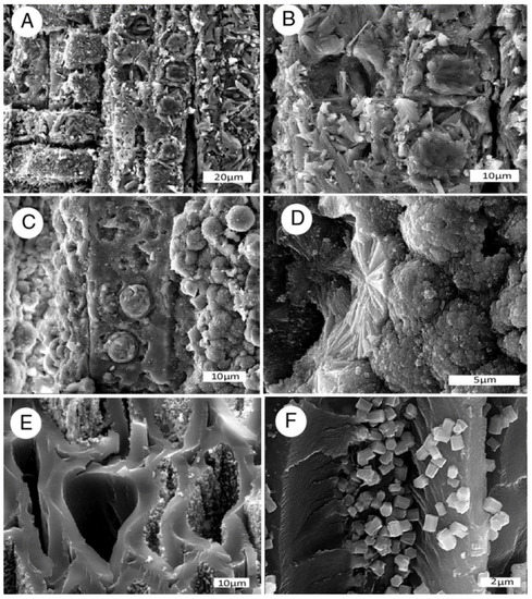 SEM photos document wide variability in the styles of mineralization, ranging from complete replacement of tissues with microcrystalline calcium phosphate (Figure 7A–C) to specimens that contain radiating crystalline masses (Figure 7D) and euhedral apatite crystals attached to surfaces of carbonized cell walls (Figure 7E,F).