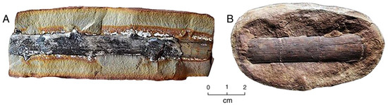 Woods mineralized with calcite. (A) Middle Pleistocene mangrove root, Acicennica nitida, Sarasota County, Florida, USA; (B) Late Cretaceous wood, Nanaimo Group, Vancouver Island, British Columbia, Canada.