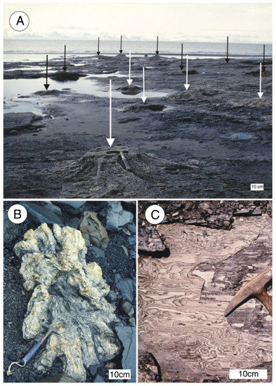 Late Miocene siderite mineralized wood Kenai Group near Homer, southern Alaska, USA. (A) Siderite mineralized stumps weathering from coal bed in intertidal zone north of Diamond Creek, Late Miocene Beluga Formation. Arrows mark individual stumps; (B) Siderite stump northwest of Michael Creek; (C) Close-up view of siderite-mineralized wood. Photos courtesy of Linda Reinike-Smith, used with permission.
