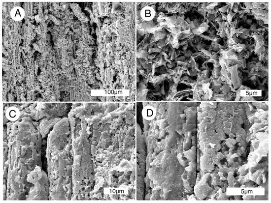 SEM radial views of Miocene wood mineralized with Mn-Fe, Virgin Valley, Nevada, USA, specimen in Figure 7C. (A,B) Tracheids mineralization showing flake-like morphology; (C,D) tracheids mineralized with blocky mineral particles.