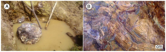 Southern Alaska: Siderite mineralized wood has been reported from Late Miocene coal beds exposed along the coast of Cook Inlet, near Homer, Alaska, but the mineralogy has not been described in detail [51,52]. Stumps and roots exposed by weathering of intertidal strata are very abundant (Figure 12).