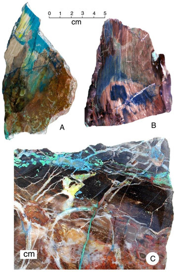 Silicified wood containing copper minerals was discovered in 2012 in the Black Sea region, when a petrified log was excavated by gold prospectors near the town of Zile, in Tolkat Province, Turkey (Figure 19). This occurrence is described in detail because this it has not previously been reported in scientific literature. The only published account of the discovery is a brief article in a Turkish newspaper [63]. Specimens were collected in 2013 by commercial collectors, who used a sledgehammer to break fragments from the log. These specimens were marketed as “colla wood” because of the presumed abundance of chryscolla, but microscopic examination reveals that this mineral is only a minor constituent; the blue and green colors are mostly due to malachite and azurite (Figure 20 and Figure 21). The regional setting suggests that the wood is of Miocene age [64]. The finders hoped to excavate for additional material, but they were unable to obtain collecting permits; the international marketing of the original specimens generated much controversy in Turkey because of public concern regarding the export of fossil specimens. Further collecting is unlikely, and the scarcity of “colla wood” has caused specimens to be highly prized by collectors.