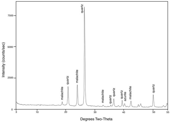 Malachite, azurite are alteration products that are visibly abundant in sandstone adjacent to the fossils wood, but their accurate detection in EDS spectra is impossible because the presence of relict carbon in the fossil wood obscures the possible presence of these carbonate minerals. Likewise, chryscolla (CuO·SiO2·2H2O) does not yield a recognizable EDS spectrum because of the high silica content of the sandstone matrix.