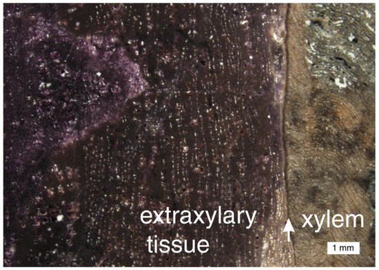 Woods mineralized with iron oxides and hydroxides typically show poor preservation of wood structure (Figure 9), probably because these minerals typically form in the largest spaces available, where their relatively large crystal or particle sizes may inhibit accurate replication of cell structure. This mode of mineralization is very different from early stages of silicification, where silica forms bonds with hydroxyl groups of organic molecules within cell walls. This “organic templating” allows anatomical features to be preserved with high fidelity [54,55]. However, some Fe-oxide mineralized woods preserve recognizable cell structure (Figure 10).