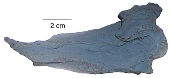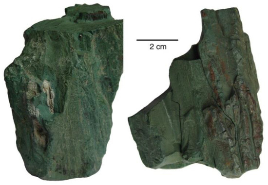 Siderite, FeCO3, is an iron mineral common in sedimentary environments, and it is associated with several fossilization processes. A well-known example is the type of ironstone concretion found in abundance at Pennsylvanian age sites at Mazon Creek, Illinois and Vigo Counties, Indiana, USA [42]. Foliage impressions are the most common fossils, but some nodules contain wood (Figure 11). The ironstone nodules consist of clay and siderite.