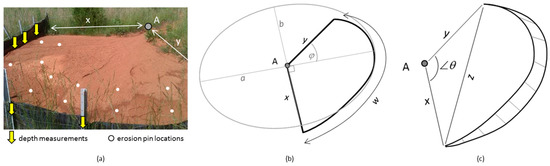 The volume of sediment deposited in the delta area (Figure 3a) was estimated by multiplying the average change in delta pin length by the surface area of the delta, and then scaling for an assumed trap efficiency of 93%. The surface area of the delta was modeled using a sector of an ellipse by extracting the silt fence outline from an aerial image, fitting an ellipse to obtain semi-major (a) and semi-minor (b) axes (Figure 3b). Arc length was calculated using Farooque’s method [52] and goodness of fit of the ellipse was assessed by comparison of the calculated arc length for the fitted ellipse with the measured arc length of the silt fence (w, Figure 3b).