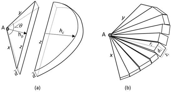 Second, the wedge volume was approximated by a series of trapezoidal pyramids, similar to the pyramid method [25], but modified to a sum of adjacent trapezoidal pyramid volumes (Vi) assembled in a fan shape (Figure 4b) using the sum of the volumes of i trapezoidal prisms (Equation (3))