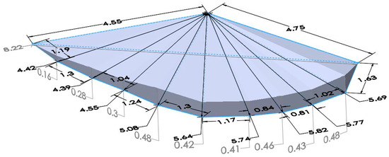 The sediment wedge was modeled using the 3D solid modeling program SolidWorks 2016 [56], using dimensions measured in the field: distance from vertex A to each fencepost (r’i), distance between fence posts (zi), and depth of sediment at each fencepost (d’i) (Figure 5). This method differs from the trapezoidal pyramid method in that the base of each pyramid was modeled as an irregular polygon. The model was drawn by first creating a sketch of the base of the sediment wedge (Figure 3). Each section of the wedge was extruded to the measured depth, and a 3-D sketch was used to define the upper surface of the section relative to the adjacent section and vertex A. Each section was trimmed to the correct size using a cut extrude defined by the 3-D sketch. Sediment yield was calculated in m3/y and adjusted to account for a 93% trap efficiency.