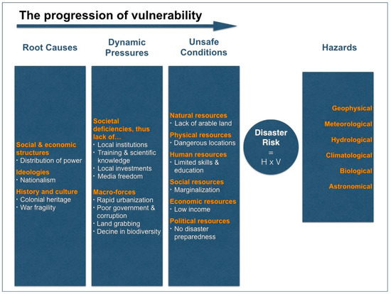The progression of vulnerability, introduced by Blaikie et al. (1994) and expanded upon by Wisner et al. (2004), provides an explanation for the interrelations between vulnerability factors (Figure 2) [,]. Three key groups of processes that cause vulnerability include root causes, dynamic pressures, and unsafe conditions. Examples of the root causes include economic, demographic, and political processes, which determine distribution of and access to critical resources, wealth, and power within a community. Root causes usually arise in the past and in a distant center of economic or political power []. The dynamic pressures category encompasses processes that transform the impacts of the root causes both temporally and spatially into unsafe conditions []. Examples of dynamic pressures include rapid urbanization or migration that change the social structure. Finally, the unsafe conditions arise in a specific form of a population’s vulnerability, such as living in hazard-prone locations in poorly constructed houses, or lacking disaster preparedness skills [].