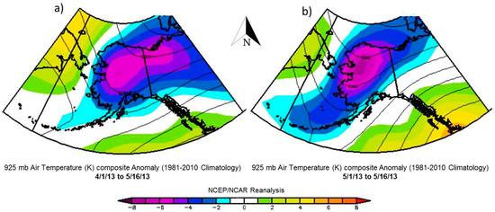 (a) Average Temperature Departure Plot, Interior Alaska, April 1-May 16, 2013; (b) Average Temperature Departure Plot, Interior Alaska, 1–16 May 2013.