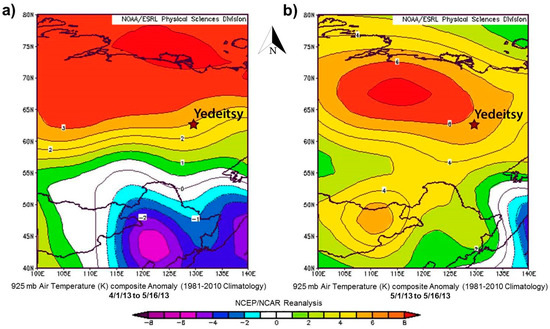 (a) Average Temperature Departure, Central Sakha, 1 April–16 May 2013; (b) Average Temperature Departure, Central Yakutia, 1–16 May 2013. Author’s note: Yedeitsy is the alternative transliteration of Edeytsy.
