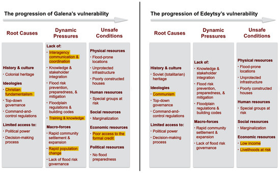 In summary, the PAR model shows that vulnerability (i.e., pressure) is rooted in socioeconomic and political processes. It is built up over time (years, decades, and centuries), and needs to be released to reduce the risk of disaster [,]. Considering everything mentioned above, the PAR model is an effective approach for analyzing vulnerability and identifying its driving forces. The PAR model is predominantly effective in explaining the vulnerability of a population for the first time, as in the case of Galena and Edeytsy.