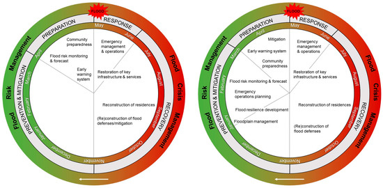 Spring Flood Management Cycle Models. (left) Examples of interagency activities during key flood risk and crisis management phases in the Sakha Republic; (right) Examples of activities during key flood risk and crisis management phases in Alaska.