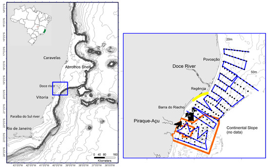 In the Doce River area, the sedimentary input is dominated by supply, characterized by the progradation of the coastline. Typically, the deposits in the region are composed of fine to very fine terrigenous sediments. Such deposits are described as regressive deposits associated to high sediment input, promoting rapid accumulation. Other parts of the Brazilian shelf also exhibit a similar sedimentary regime and morphological characteristics, being dominated by deltas in between starved areas [23]. Four main deltas occur (from south to north): the Paraíba do Sul river delta, Doce river delta, Jequitinhonha river delta, and São Francisco river delta. Sedimentation patterns in the adjacent shelf of these deltas are very similar. Along the narrow eastern Brazilian shelf, [24] identified fine terrigenous sediment facies associated to river mouths or shelf incised valleys and carbonate dominated facies. For the São Francisco River shelf (AL), [25] described a progradation zone in the shelf, characterized by mud and muddy sands.